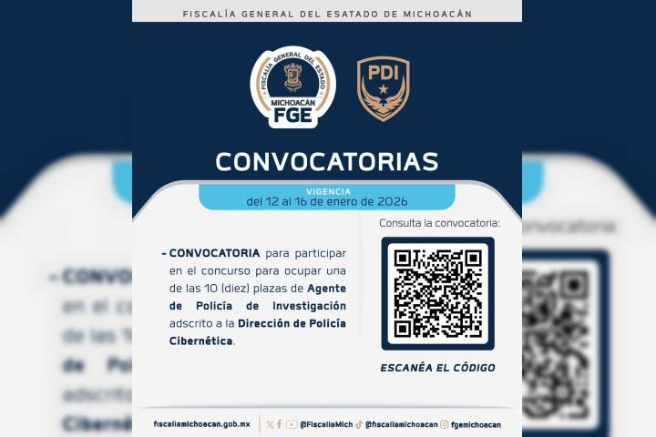 NOTICIAS 12/01/2026Emite FGE convocatoria para concurso de plazas de agente de la PolicÃa de Investigación Bajo el objetivo de garantizar eficiencia y fortalecimiento en la investigación de delitos cibernéticos, la FiscalÃa General del Estado de Michoacán (FGE) emitió una convocatoria dirigida a todas las personas interesadas en participar en el concurso para ocupar una de las diez plazas de agente de la PolicÃa de Investigación, adscrito a la Dirección de la PolicÃa Cibernética.