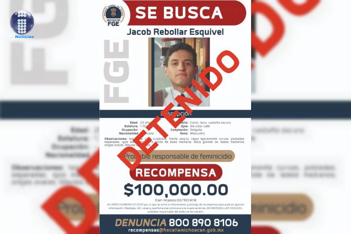 NOTICIAS 25/11/2021Detiene FGE a presunto responsable del feminicidio de Danna Kenneth C.Resultado de trabajos de investigación realizados por la Fiscalía General del Estado de Michoacán (FGE) en coordinación con autoridades del estado de Hidalgo, fue detenido Jacob Rebollar Esquivel, por su posible relación en el feminicidio de Danna Kenneth C., ocurrido en el municipio de Zitácuaro.