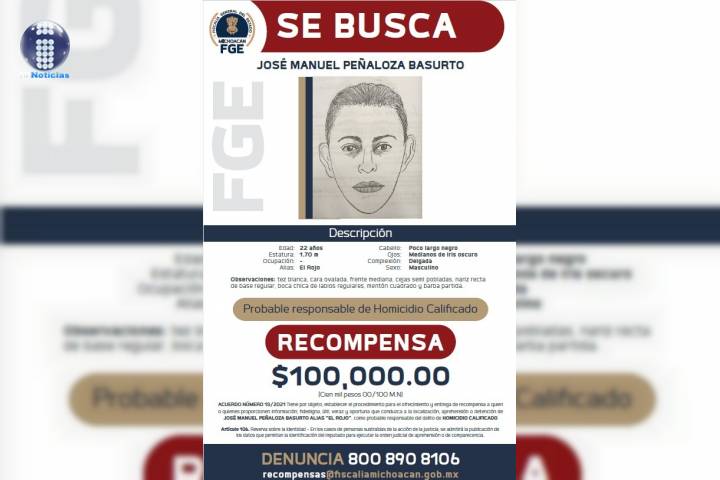 La Fiscalía General del Estado de Michoacán (FGE) expidió los acuerdos por el que se emite el Ofrecimiento y Entrega de Recompensa para quienes aporten información fidedigna, útil y oportuna que conduzca a la localización de José Manuel Peñaloza Basurto (El Rojo); Magnun Alejandro Huerta Estrada (El Pato); y Diego Manuel Corona Zarate (El Loco), probables responsables del delito de Homicidio Calificado, ocurrido la madrugada del 18 de oct...