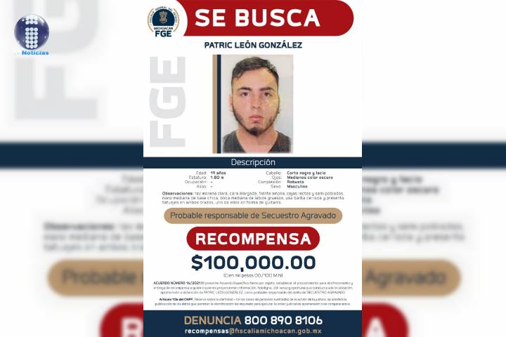 La Fiscalía General del Estado de Michoacán (FGE) expidió el acuerdo por el que se emite el Ofrecimiento y Entrega de Recompensa para quienes aporten información fidedigna, útil y oportuna que conduzca a la localización de Patric León González, probable responsable del delito de Secuestro Agravado. Derivado de actos de investigación emprendidos con motivo de estos hechos, la FGE obtuvo datos de prueba, objetivos y contundentes para ac...