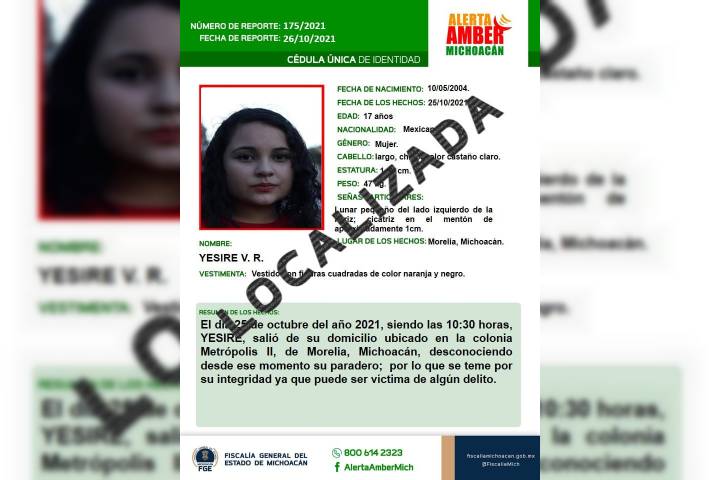 NOTICIAS 28/10/2021Desactiva FGE Alerta Amber; localiza a una adolescente reportada como desaparecida en MoreliaLa Fiscalía General del Estado de Michoacán (FGE) desactivó Alerta Amber, al localizar a una adolescente de 17 años de edad, que fue reportada como desaparecida, en esta ciudad.