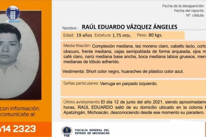 NOTICIAS 19/06/2021Realiza Fiscalía General actuaciones por desaparición de un joven en Apatzingán La Fiscalía General del Estado de Michoacán (FGE) realiza actos de investigación con relación a la desaparición del joven Raúl Eduardo Vázquez Ángeles, ocurrida el pasado 12 de junio en esta ciudad de Apatzingán.