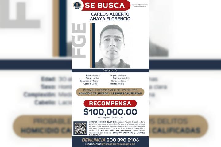 Como resultado de las investigaciones realizadas por la Fiscalía General del Estado de Michoacán (FGE), relacionadas con el homicidio de María de los Ángeles E., de 23 años de edad, así como con el delito de lesiones calificadas en agravio de Irving David C., de 20 años, la institución emitió una cédula de ofrecimiento de recompensa para quien aporte información que permita la localización y detención del probable responsable. D...