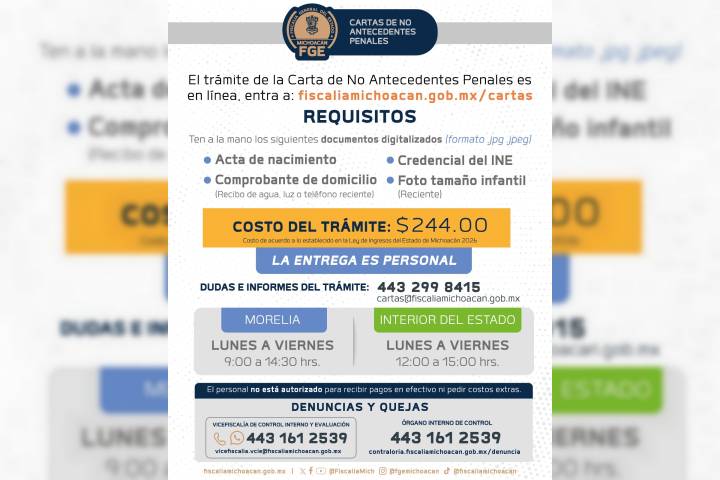 Durante el año 2025, la Fiscalía General del Estado de Michoacán (FGE) expidió un total de 39 mil 609 Cartas de No Antecedentes Penales en las distintas regiones de la entidad, consolidando este trámite como uno de los servicios con mayor demanda por parte de la ciudadanía. De acuerdo con el informe correspondiente al periodo del 1 de enero al 31 de diciembre, la región Morelia concentró el mayor número de solicitudes, con 20 mil 974 ...