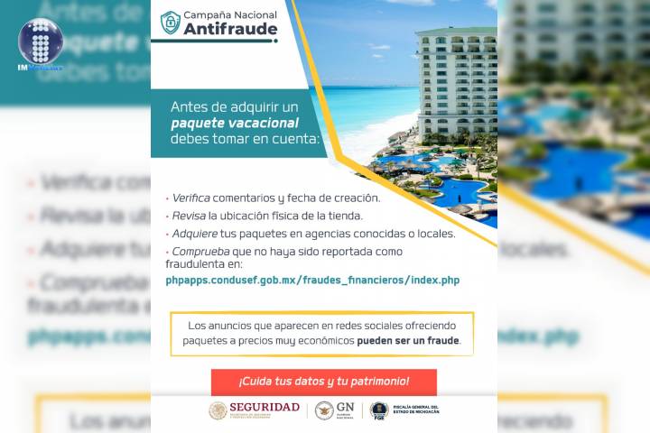 La institución que encabeza el Fiscal General, Adrián López Solís, recomienda a las y los michoacanos verificar la autenticidad de estas ofertas, las cuales se promocionan para los diversos periodos vacacionales.... Ver más...