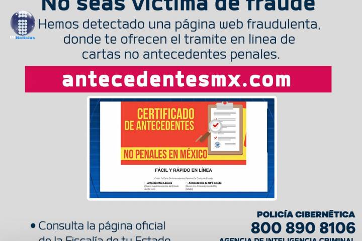 NOTICIAS 23/10/2020Alerta FGE sobre página falsa para tramitar Carta de No Antecedentes PenalesLa Fiscalía General del Estado de Michoacán (FGE) hace de conocimiento a la ciudadanía que derivado de ciberpatrullajes, se detectó la presencia de la página fraudulenta antecedentesmx.com, que ofrece a las personas tramitar la Carta de No Antecedentes Penales.