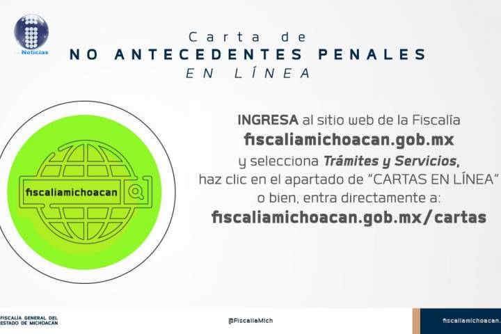 NOTICIAS 14/10/2020Invita FGE a tramitar en línea la Carta de No Antecedentes Penales A fin de brindar un mejor servicio a las y los michoacanos que requieran tramitar la Carta de No Antecedentes Penales, la Fiscalía General del Estado de Michoacán (FGE) invita a realizar la solicitud de este documento en línea, a través de su sitio oficial www.fiscaliamichoacan.gob.mx/cartas y pone a disposición de la ciudadanía el número 3 22 36 00 para mayores informes respecto a este proceso.