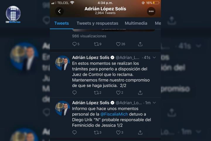 Lo anterior fue confirmado por el fiscal general del estado, Adrián López Solís, esto por medio de su cuenta oficial de Twitter (@Adrian_LopezS), en donde divulgó: "Informo que hace unos momentos personal de la @FiscaliaMich detuvo a Diego Urik "N" probable responsabl... Ver más...