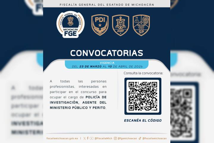 Como parte de la transformación institucional que impulsa la Fiscalía General del Estado de Michoacán (FGE), su titular, Carlos Torres Piña, emitió una convocatoria interna y externa, para ocupar 94 plazas de agentes del Ministerio Público, policías de Investigación y personal pericial en todas las regiones de la entidad. "El objetivo es claro: fortalecer nuestras capacidades operativas y garantizar un servicio de procuración de justi...