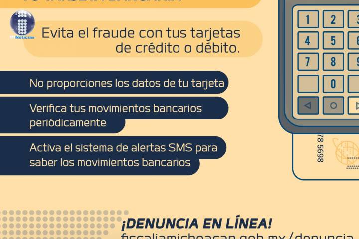 NOTICIAS 19/05/2020Exhorta FGE, a proteger datos de tarjetas bancarias para evitar fraudes Con la finalidad de evitar que la población sea víctima de fraudes que atenten contra su patrimonio y tranquilidad, la Fiscalía General del Estado de Michoacán (FGE), exhorta a la ciudadanía a extremar precauciones en el uso de sus tarjetas de débito y crédito bancarias.
