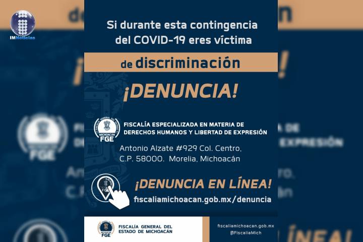 NOTICIAS 28/04/2020Exhorta FGE, a denunciar actos de discriminación durante contingencia sanitaria A fin de evitar actos de discriminación que atenten contra los derechos humanos de las personas, durante el actual periodo de contingencia por el virus COVID-19, la Fiscalía General del Estado de Michoacán (FGE), exhorta a la población a denunciar toda conducta a través de la cual sean vulneradas estas prerrogativas.