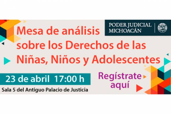 NOTICIAS 12/04/2019Poder Judicial congregará a especialistas para hablar de los derechos de niños, niñas y adolescentes Con el objetivo de analizar temas relacionados al derecho a la salud e integridad fÃsica, emocional, mental e interés superior de las personas menores de 18 años, el Poder Judicial de Michoacán llevará a cabo la Mesa de análisis sobre los derechos de las niñas, niños y adolescentes el 23 de abril.