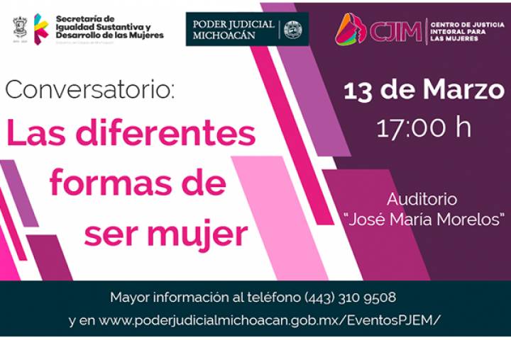 NOTICIAS 08/03/2019Poder Judicial realizará conversatorio para analizar dificultades que enfrenta la mujer en distintos ámbitos sociales Para seguir aportando a la sensibilización de servidores públicos en torno a los derechos humanos de la mujer, el Poder Judicial de Michoacán realizará el Conversatorio: Las diferentes formas de ser mujer el próximo 13 de marzo a las 17 horas en el Auditorio del Palacio de Justicia José María Morelos.