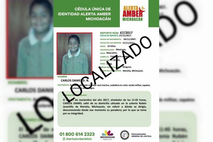 Como parte de las acciones que lleva a cabo para salvaguardar la integridad de la niñez michoacana, la ProcuradurÃa General de Justicia del Estado (PGJE), a través de la FiscalÃa Especializada en Personas Desaparecidas, localizó a un menor de 10 años de edad que este dÃa fue reportado desaparecido en esta ciudad de Morelia, lo que motivó la activación de Alerta Amber.