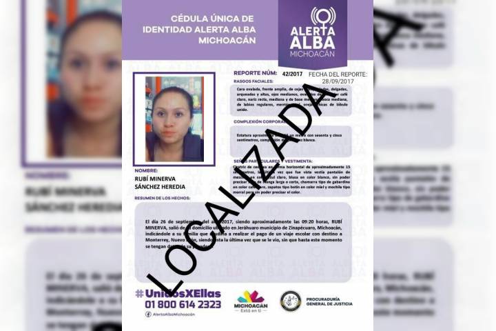 La Procuraduría General de Justicia del Estado (PGJE), a través de la Fiscalía Especializada en Personas Desaparecidas, localizó a una joven de 19 años de edad que había sido reportada desaparecida el sábado pasado en esta ciudad de Uruapan.