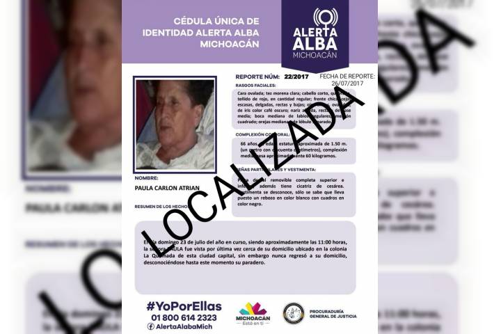 NOTICIAS 27/07/2017Localiza PGJE a sexagenaria reportada desaparecida en MoreliaLa ProcuradurÃa General de Justicia del Estado (PGJE), a través de la FiscalÃa Especializada en Personas Desaparecidas, logró localizar a una mujer que fue reportada desaparecida el pasado domingo en una colonia del Poniente de esta ciudad de Morelia.