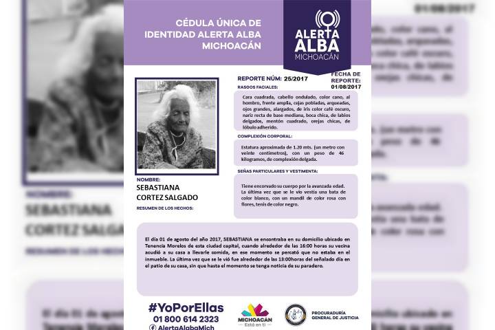 NOTICIAS 02/08/2017PGJE localiza a Doña Sebastiana, estaba desaparecida, en Morelia La ProcuradurÃa General de Justicia del Estado (PGJE), a través de la FiscalÃa Especializada en Personas Desaparecidas, localizó a una mujer de 104 años de edad que el martes pasado, fue reportada como desaparecida en esta ciudad de Morelia.
