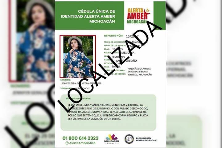 La Procuraduría General de Justicia del Estado (PGJE), a través de la Fiscalía Especializada de Personas Desaparecidas, informó de la localización de una menor de edad reportada desaparecida el pasado 29 de abril en la ciudad de Morelia.