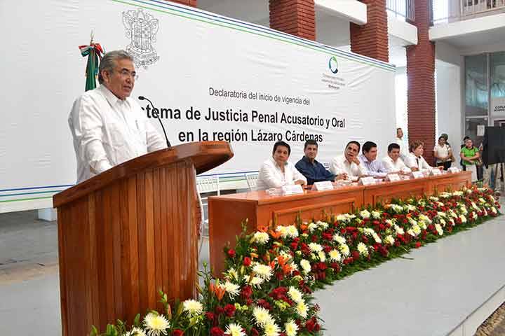 "El sistema acusatorio adversarial oral se basa en el estricto respeto de los derechos humanos y permite brindar un servicio de impartición de justicia más ágil y transparente", señaló Marco Antonio Flores Negrete, presidente del Poder Judicial de Michoacán, durante la declaratoria de inicio -a partir del 9 de mayo-, de la vigencia del Nuevo sistema de justicia penal en la Región de Lázaro Cárdenas.