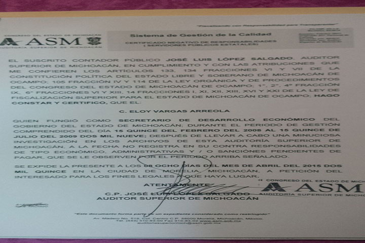 NOTICIAS 05/08/2015ASM exoneró a Eloy Vargas de cualquier observación económica y administrativaLa Auditoria Superior de Michoacán exoneró de cualquier observación económica y administrativa a Eloy Vargas Arreola, durante un periodo de su gestión como Secretario de Desarrollo económico (2008 - 2012).