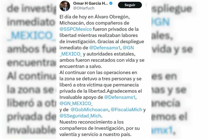 A través de su cuenta de X, Omar García Harfuch, titular de la Secretaría de Seguridad y Protección Ciudadana de México (SSPC), informó que durante la localización y rescate de los dos agentes de la citada institución, quienes habían sido privados ilegalmente de la libertad en el municipio de Álvaro Obregón, también se detuvo a tres involucrados en el delito y se liberó a una víctima más.