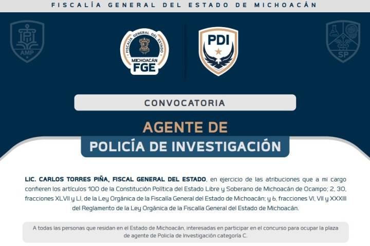 NOTICIAS 08/09/2025Convoca FGE a aspirantes para ocupar cargo de agentes de la Policía de Investigación La Fiscalía General del Estado de Michoacán (FGE) convoca a personas residentes en la entidad, interesadas en participar en el concurso de selección para sumarse a sus filas como agentes de Policía de Investigación.