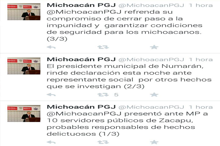 Fue por medio de su perfil de twitter, @MichoacanPGJ, donde el funcionario hizo el anuncio: "PGJ puso a disposición de la PGR a Ana Patiño López... Ver más...