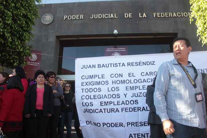 Aproximadamente 700 empleados sindicalizados de la delegación en Morelia del Poder Judicial de la Federación exigen la homologación salarial a la instancia competente, pues argumentaron que desde hace más de 12 años no tienen aumento de sueldo, derivado de ello, optaron por manifestarse ordenadamente sin entorpecer las actividades en el edificio del PJF.