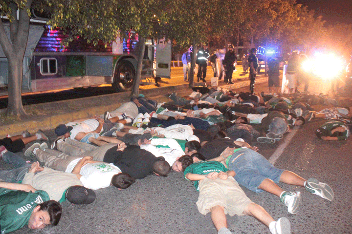 NOTICIAS 01/02/2014Pagan multa y dejan ir a porristas del LeónEn una clara demostración de actitud antideportiva, que únicamente empaña la fiesta del fútbol mexicano, fueron detenidos 75 aficionados de la porra oficial del equipo de León, luego de diversos actos vandálicos realizados al finalizar el encuentro deportivo de esta escuadra contra Monarcas Morelia, la noche del pasado viernes; todos ellos fueron remitidos a Barandilla.