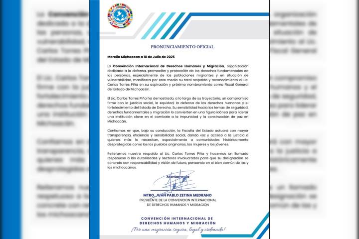 En el marco del proceso de selección para la titularidad de la Fiscalía General del Estado de Michoacán, la Convención Internacional de Derechos Humanos y Migración manifestó públicamente su respaldo al aspirante Carlos Torres Piña, destacando su trayectoria, sensibilidad social y compromiso con la justicia. A través de una carta difundida este fin de semana, la organización internacional reconoció a Torres Piña como un perfil con ...