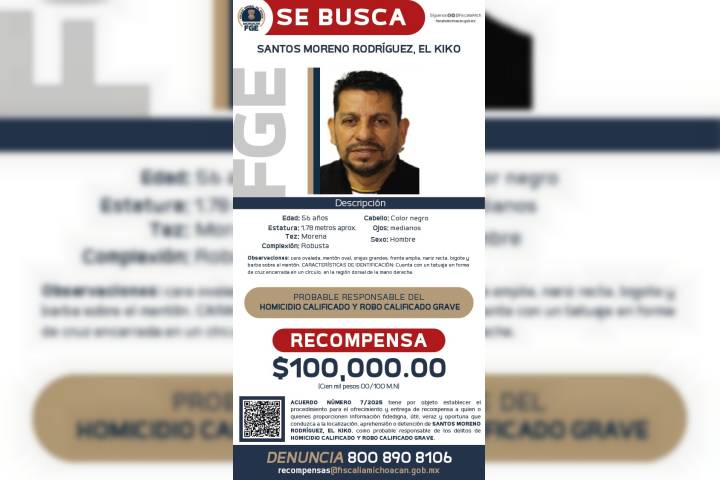 NOTICIAS 19/06/2025Publica FGE cédula de recompensa para la detención del presunto responsable del homicidio del edil de Tacámbaro y su escoltaResultado de trabajos de investigación que se llevaron a cabo con motivo del homicidio del presidente municipal de Tacámbaro, Salvador Bastida García, y su escolta Pastor C., permitieron obtener datos objetivos y contundentes para establecer la posible responsabilidad en estos hechos, de Santos Moreno Rodríguez alias "El Kiko", por cuya localización, se ha emitido una cédula de recompensa que este día fue publicada por la Secretaría de Go... Ver más...