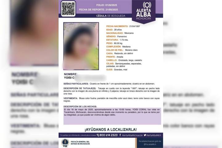 Se trata de Yoisi C., de 28 años de edad, ella fue vista por última vez con vida en la c... Ver más...