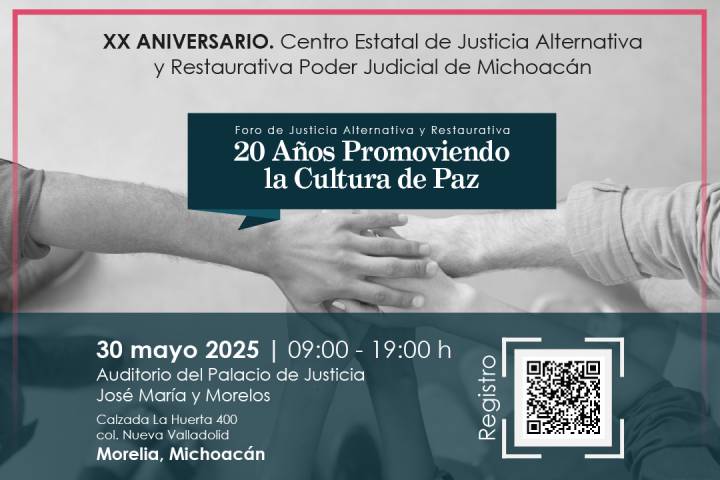 El Poder Judicial de Michoacán llevará a cabo el Foro de Justicia Alternativa y Restaurativa "20 Años Promoviendo la Cultura de Paz" conmemorativo por el vigésimo aniversario del Centro Estatal de Justicia Alternativa y Restaurativa (CEJAR), en el que especialistas compartirán sus experiencias, reflexiones y aportaciones sobre los retos y avances en la solución pacífica de conflictos.