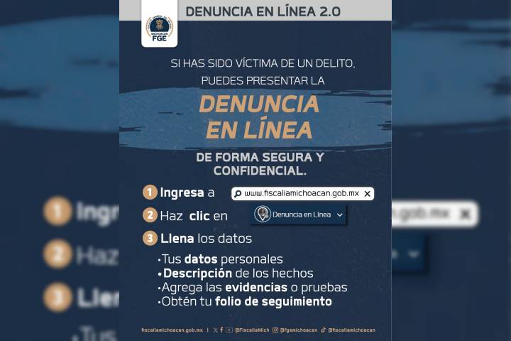 NOTICIAS 06/03/2026Torres Piña: Denuncia en Línea 2.0 ya concentra el 30% de las denuncias que recibe la FGEEl Fiscal General del Estado de Michoacán, Carlos Torres Piña, informó que la modernización tecnológica en la Fiscalía General del Estado de Michoacán (FGE) comienza a reflejar resultados. Desde la puesta en marcha de la plataforma Denuncia en Línea 2.0, en octubre de 2025, se han recibido 24 mil 699 denuncias, de las cuales el 30 por ciento fueron presentadas a través de medios digitales, consolidando este mecanismo como una vía cada v... Ver más...