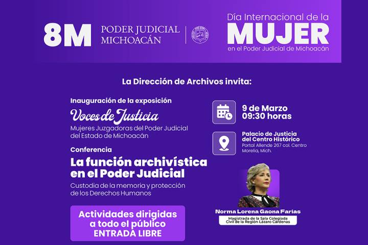 NOTICIAS 03/03/2026En el marco del 8M, el Poder Judicial de Michoacán realizará actividades para visibilizar el papel de las mujeres en la justicia El Poder Judicial de Michoacán se suma a la conmemoración del Día Internacional de la Mujer con diversas actividades institucionales dirigidas tanto a la ciudadanía como a su personal, reafirmando su compromiso con la igualdad sustantiva, la perspectiva de género y el reconocimiento al papel de las mujeres en la impartición de justicia.