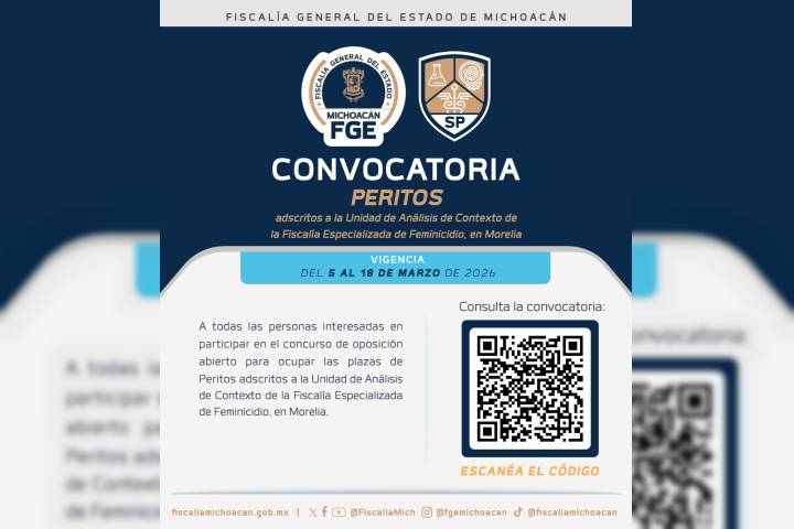 NOTICIAS 05/03/2026Fiscalía de Michoacán emite convocatoria para integrar personal pericial a la Fiscalía Especializada de FeminicidioCon el compromiso de fortalecer las investigaciones con perspectiva de género y consolidar equipos técnicos altamente especializados, la Fiscalía General del Estado de Michoacán (FGE) emitió este día la convocatoria para ocupar siete plazas de Perito, adscritas a la Unidad de Análisis de Contexto de la Fiscalía Especializada de Feminicidio.