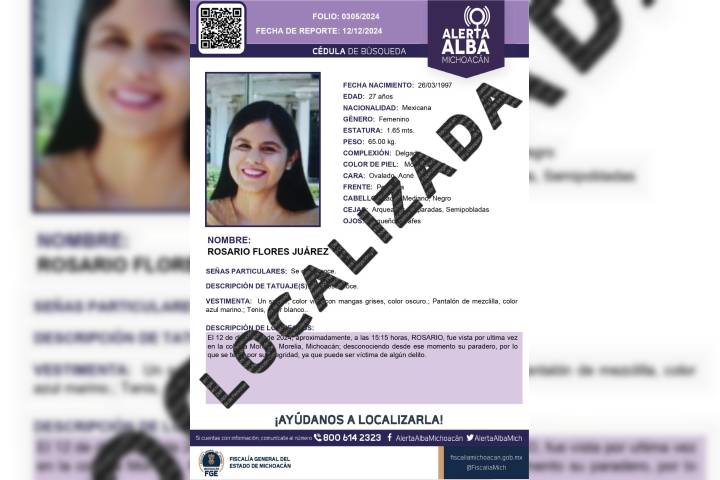 NOTICIAS 15/12/2024Desactiva FGE Alerta Alba, tras ser localizada Rosario F., reportada como desaparecida en MoreliaLa Fiscalía General del Estado de Michoacán (FGE) desactivó la Alerta Alba de Rosario F., tras ser localizada, sin vida, en la presa de Cointzio, durante una acción realizada en coordinación con la Comisión de Búsqueda, Policía Municipal de Morelia, elementos de Protección Civil, y una asociación civil