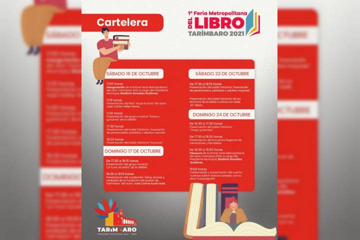 NOTICIAS 12/10/2021Invitan a presenciar la primera edición de la Feria Metropolitana del Libro en TarÃmbaroEl Presidente Municipal de TarÃmbaro, Bladimir González Gutiérrez, anunció la primera edición de la Feria Metropolitana del Libro en TarÃmbaro 2021, la cual se llevará a cabo del 16 al 24 de octubre.