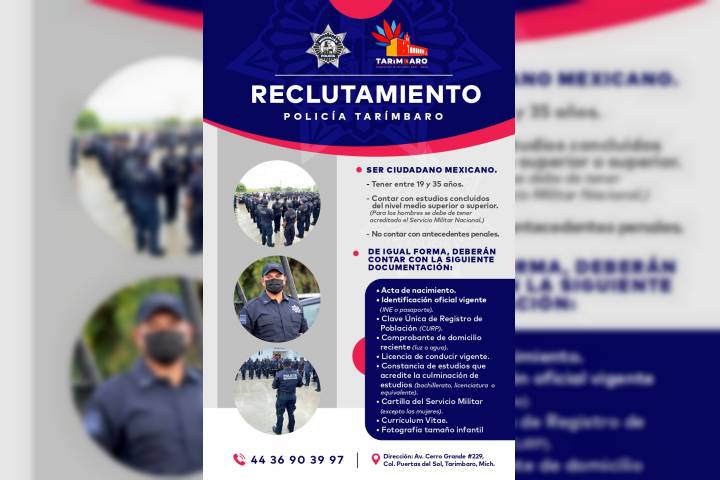 Con el objetivo de fortalecer la fuerza policial en Tarímbaro, la Secretaría de Seguridad Pública (SSP) convoca a hombres y mujeres con vocación de servicio, honestidad y respeto a formar parte de la Policía Municipal de Tarímbaro. Las y los interesados que deseen unirse a las filas de la Policía Municipal deberán cumplir con los siguientes requisitos: ? Ser ciudadano mexicano ? Tener entre 19 y 35 años ? Contar con estu...