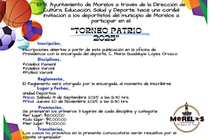 Con gran entusiasmo y en el marco de las celebraciones patrias, el presidente municipal, Julio César Conejo Alejos, anunció la convocatoria al "Torneo Patrio 2025", una justa deportiva que busca fomentar la convivencia, el orgullo morelense y la pasión por el deporte en el municipio. En ese sentido, se informó que este torneo, organizado a través de la Dirección de Cultura, Educación, Salud y Deporte, contempla disciplinas de voleibol f...