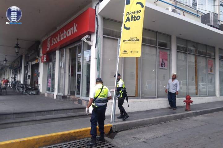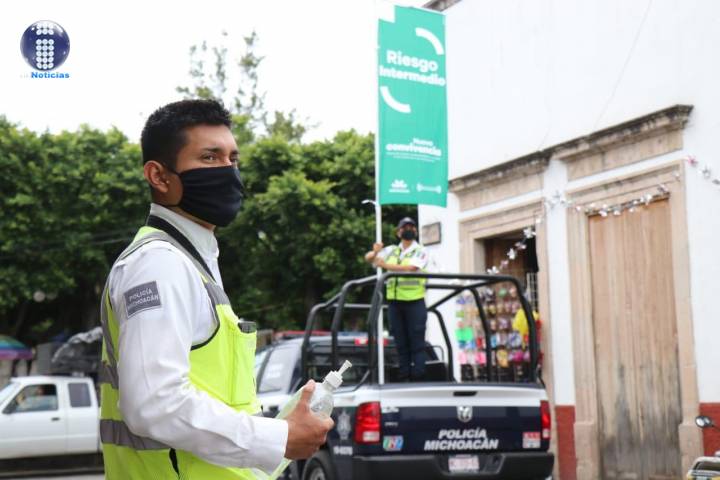 El color de esta Bandera indica que el riesgo de contagio es alto, por lo que oficiales de la Policía Michoacán llevan a cabo en las zonas de mayor afluencia la difusión de las princ... Ver más...