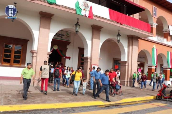 En conmemoración del 34 y 2 aniversario de los terremotos de 1985 y 2017, autoridades de diferentes corporaciones de seguridad y gubernamentales en Apatzingán, participaron en el macro simulacro de sismo en el palacio municipal