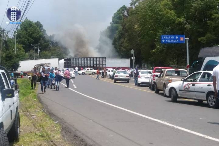 Pobladores de Capacuaro retienen a cinco agentes de la Policía Michoacán e incendiaron una camioneta de una empresa abarrotera que mantenían en el bloqueo de la carretera Uruapan-Paracho, a la altura de la desviación a Los Reyes, ello para exigir la liberación de cuatro de sus compañeros acusados de "talamontes" detenidos en San Andrés Corú.