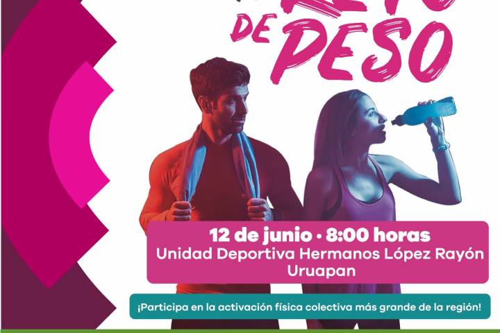 NOTICIAS 06/06/2019Uruapan, listo para recibir "Reto de Peso"El municipio de Uruapan se encuentra listo para recibir a los participantes de la primera activación física masiva del "Reto de peso", a realizarse el miércoles 12 de junio en la Unidad Deportiva "Hermanos López Rayón".