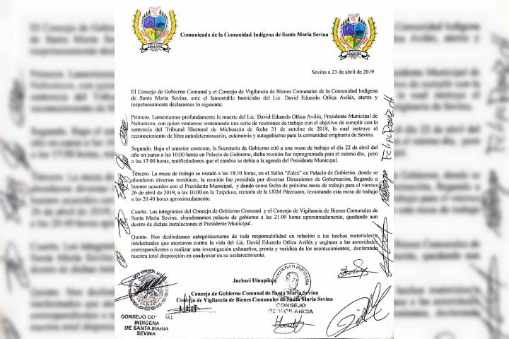 NOTICIAS 24/04/2019El Concejo de Gobierno Comunal de Sevina se deslinda del asesinato del Alcalde de Nahuatzen