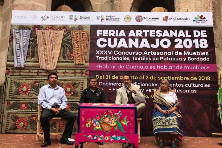 NOTICIAS 22/08/2018Invita Cuanajo a su feria artesanalEn el marco de la Feria Artesanal de Cuanajo que se realizará del 31 de agosto al 2 de septiembre, el Instituto del Artesano Michoacano (IAM), en coordinación con el Fondo Nacional para el Fomento de las Artesanías (Fonart), el Ayuntamiento de Pátzcuaro y las Autoridades Comunales de Cuanajo, llevarán a cabo el XXXV Concurso Artesanal de Muebles tradicionales, Textiles de patakua y bordado.