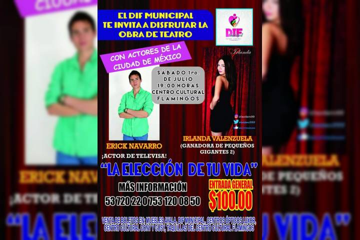 NOTICIAS 14/06/2017DIF Municipal invita a la obra de teatro "La Elección de tu Vida"El DIF Municipal que preside la maestra Lupita Chan Panti promueve la obra de teatro "La Elección de tu Vida", con el fin de recaudar fondos que permitan solventar la compra de sillas de ruedas, andaderas y otros equipos para ayudar a personas en situación vulnerable.