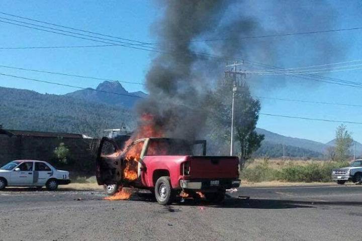 La unidad fue incendiada en el Libramiento de Aranza, es una camioneta Chevrolet Cheyenne, de color rojo.
