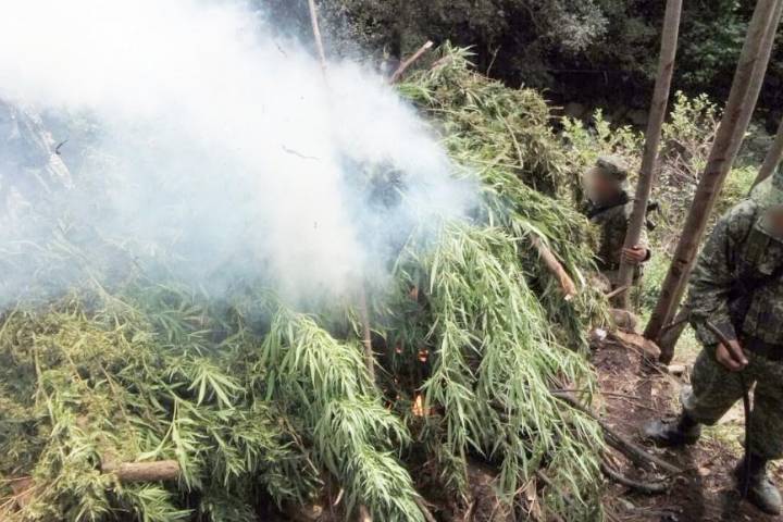 Elementos de la Secretaría de Seguridad Pública y efectivos de la Secretaría de la Defensa Nacional (Sedena) aseguraron e incineraron alrededor de 500 plantas de marihuana en Gabriel Zamora.