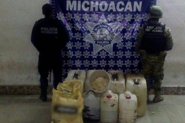 Elementos de la Policía Michoacán, en coordinación con efectivos de la Secretaría de la Defensa Nacional (Sedena), aseguraron en el municipio de La Huacana un laboratorio clandestino.